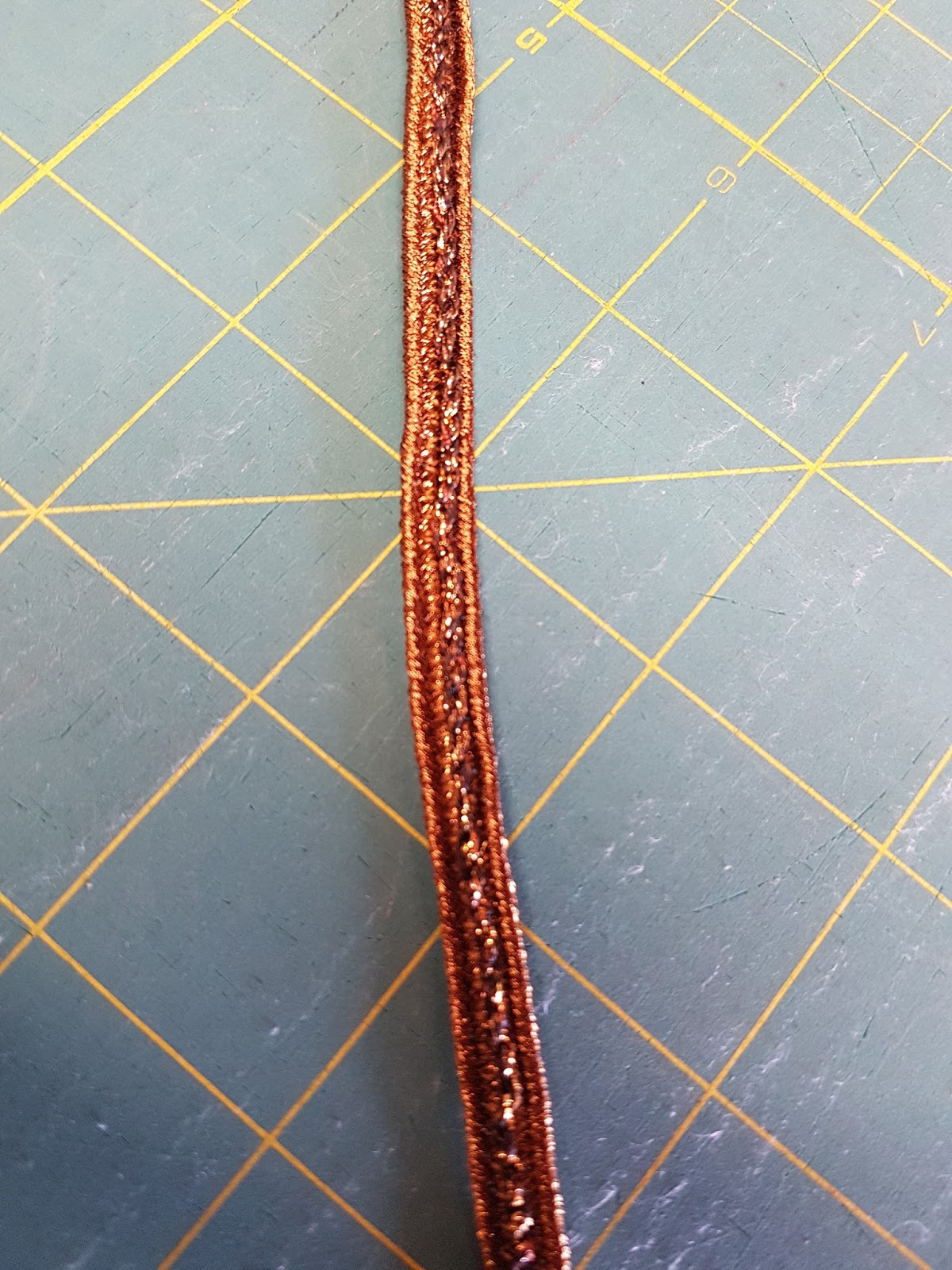 | Sewed the two brass braids together using my open toe applique foot, Zigzag stitch and marching thread. |
